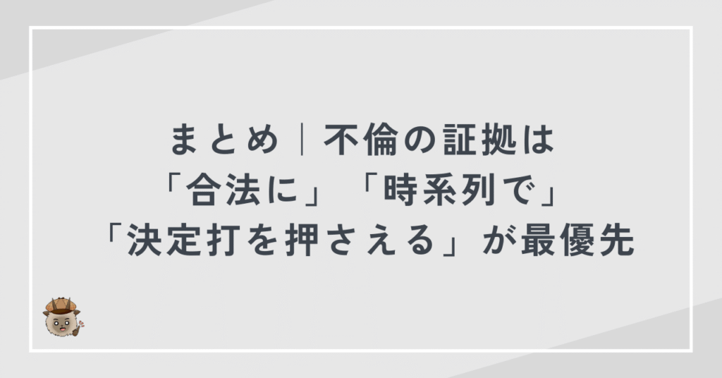 まとめ|不倫の証拠は「合法に」「時系列で」「決定打を押さえる」が最優先