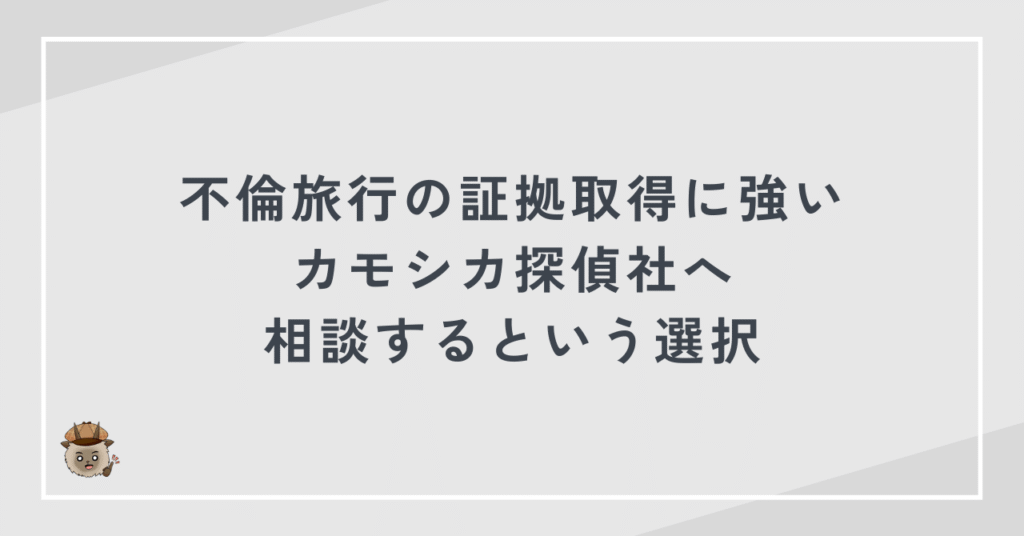 不倫旅行という重要な局面を無駄にしないためにも、証拠取得に強いカモシカ探偵社へ一度相談してみてください。