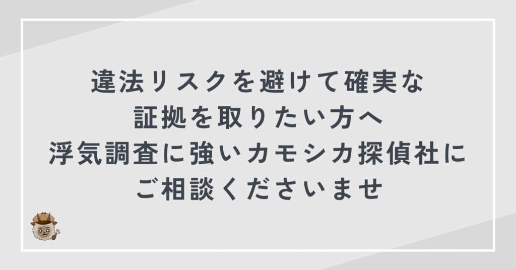 違法リスクを避けて確実な証拠を取りたい方へ|浮気調査に強いカモシカ探偵社にご相談ください