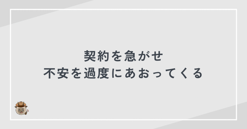 不安を強調して即決を迫る営業手法は、典型的な危険信号です。