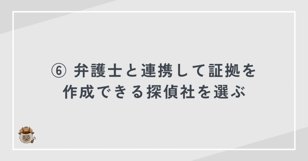 証拠として使える報告書を受け取るためには、弁護士と連携し、裁判を想定した調査を行う探偵社を選ぶ必要があります。